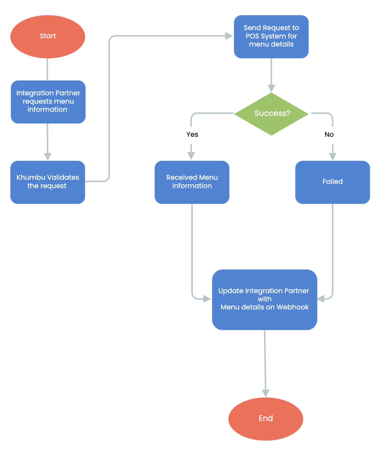 The workflow concludes after the integration partner is updated with the menu details or notified of the failure.