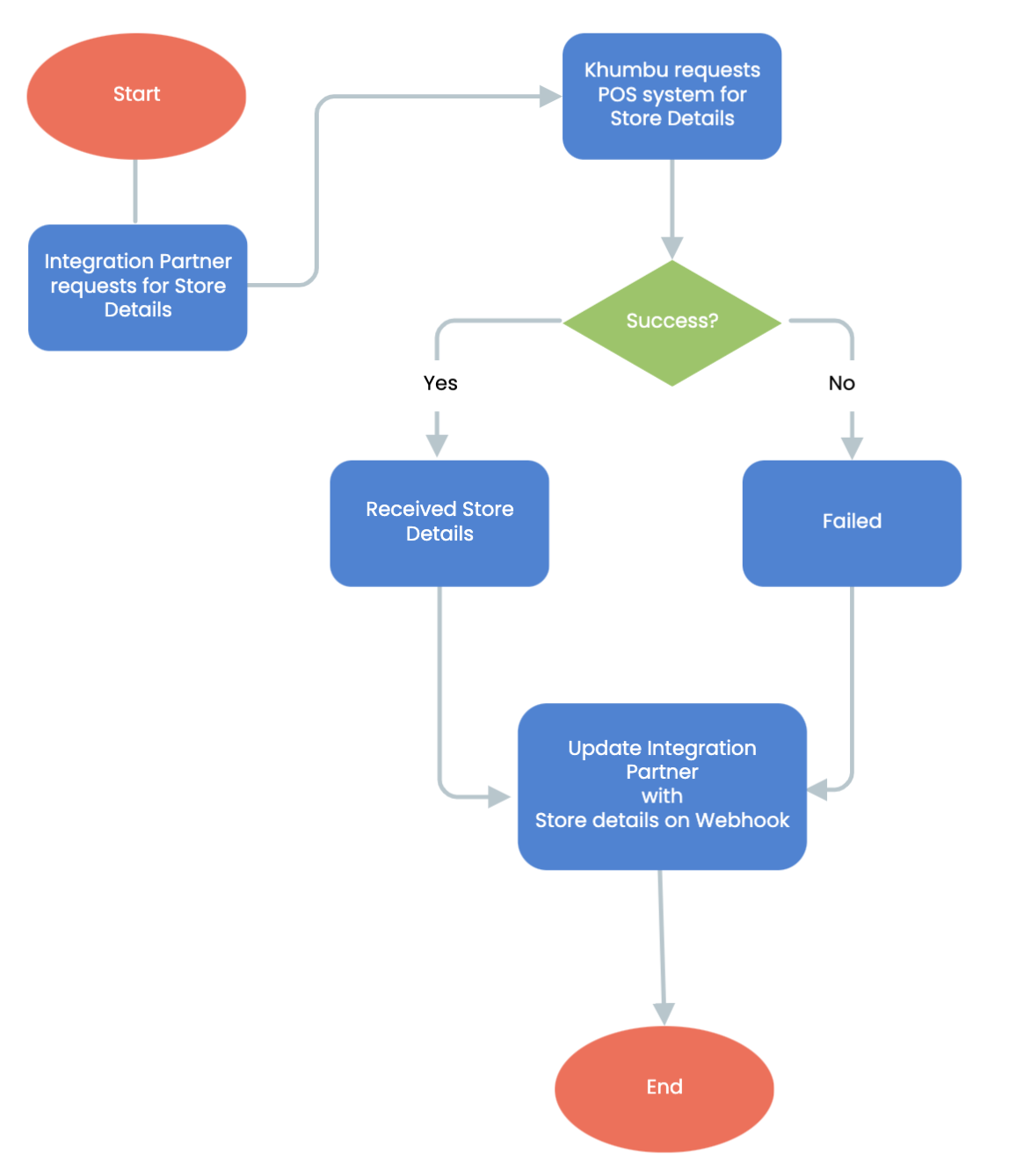 The workflow begins when an integration partner submits a request to fetch store details. - Integration Partner Requests for Store Details: